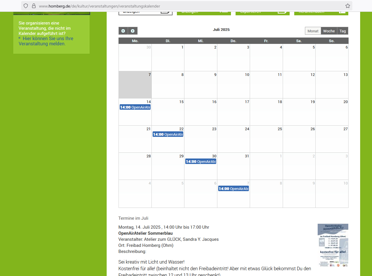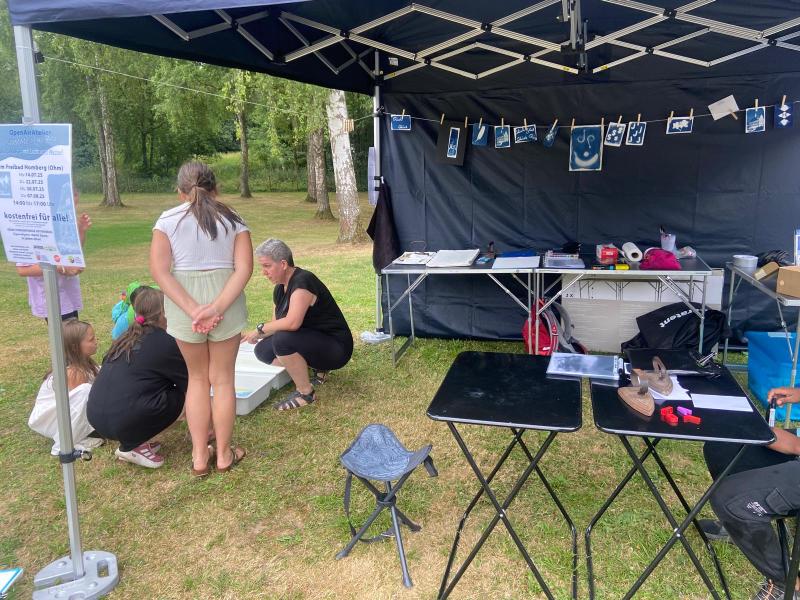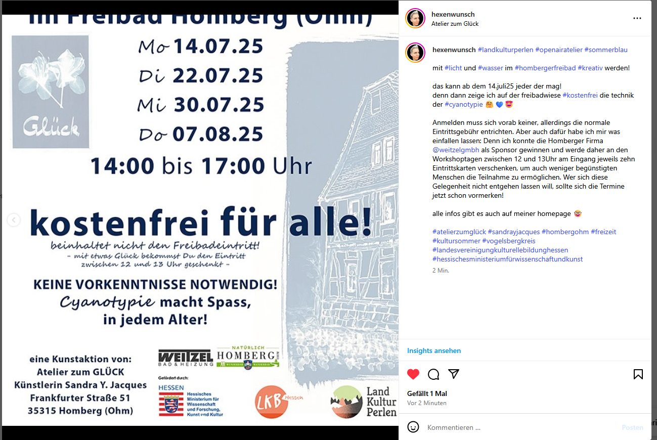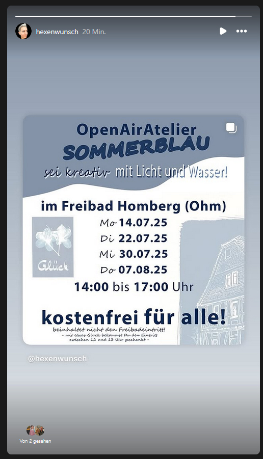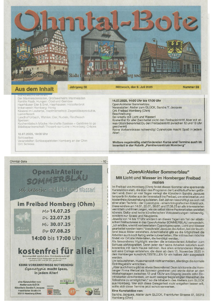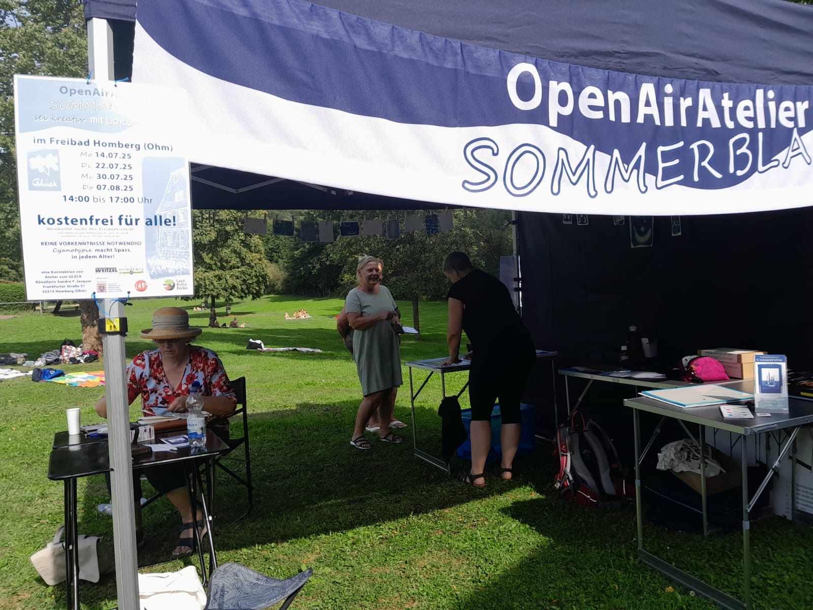 Innerhalb von vier Wochen im Sommer 2025 haben gut mehr als hundert Menschen mein OpenAirAtelier SOMMERBLAU im Freibad von Homberg (Ohm) besucht, bestaunt und begeistert mitgemacht. Mit 15-20 Teilnehmern jeden Alters pro Termin hatte ich ursprünglich gerechnet – schön, dass es dann deutlich mehr wurden!