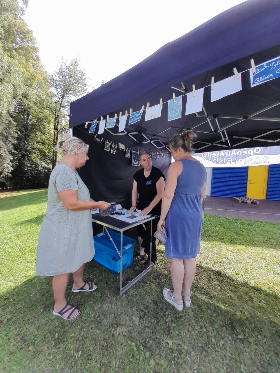 Denn vier Mal verlegte ich temporär mein Atelier aus der Innenstadt ins Freibad, um eine kreative und kostenfreie Abwechslung zu bieten. Dass das Wetter jetzt in den ersten drei Wochen nicht wirklich mitspielen wollte, hat diejenigen die dann trotzdem kamen, nicht gestört.