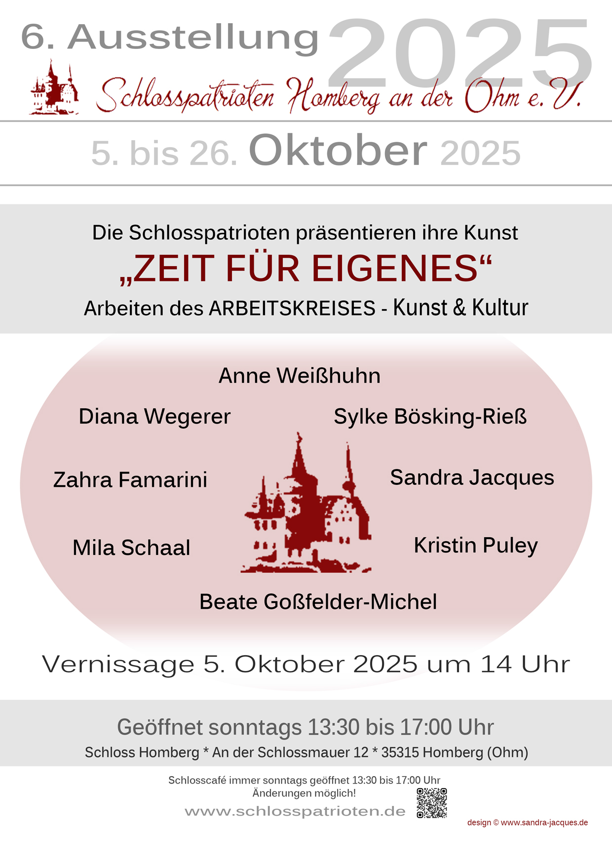 Die Vernissage findet am 5. Oktober 2025 um 14 Uhr vor oder bei kühlerem Wetter im Schloss in Homberg (Ohm) statt. Auf regen Austausch mit Gästen und Künstlern, freuen sich alle Schlosspatrioten auch anschließend bei Kaffee und Kuchen im gemütlichen Schlosscafé.