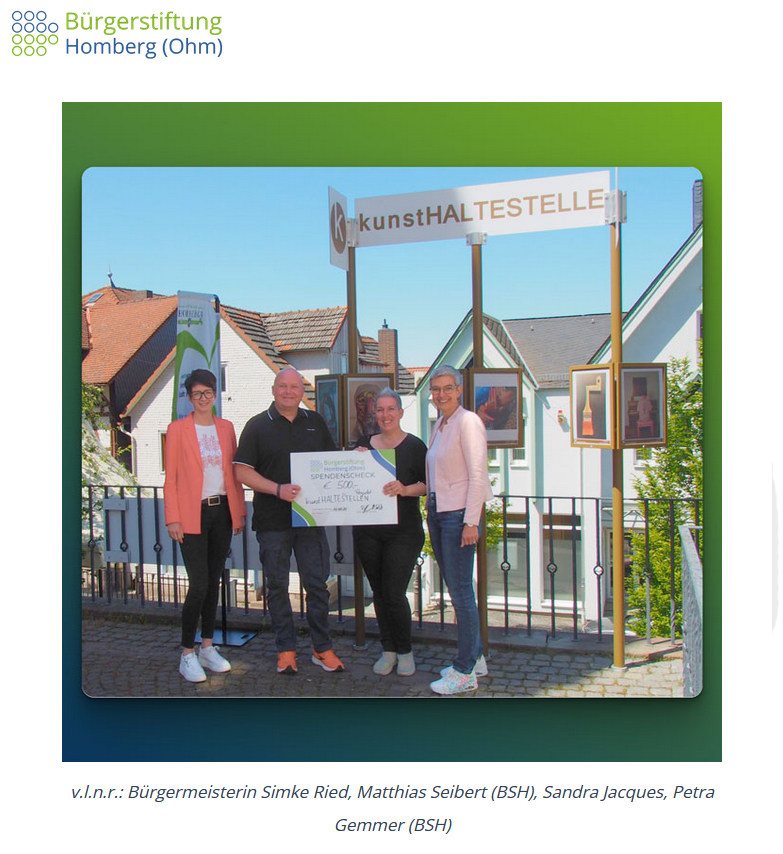 Wer noch etwas für die kunstHALTESTELLEN spenden möchte und dafür eine Spendenquittung benötigt, der kann mit dem Verwendungszweck „kunstHALTESTELLEN“ an die Bürgerstiftung Homberg spenden. Diese leiten dann treuhänderisch den Betrag an mich weiter und stellen die Bescheinigung für euch aus.
