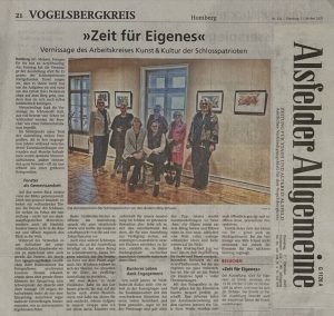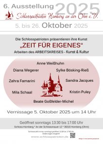 Die Schlosspatrioten präsentieren ihre KunstDas es den Schlosspatrioten in Homberg (Ohm) nicht nur um die Aufgaben im und rund um den Erhalt ihres Denkmals oben auf dem Berg geht, zeigt ihre nächste Kunstausstellung sehr deutlich. Die mittlerweile auf neun Mitglieder angewachsene Truppe des Arbeitskreises Kunst&Kultur im Homberger Schloss, bildet dieses Jahr mit ihrer Gruppenausstellung „Zeit für Eigenes“ selbst den Abschluss ihrer diesjährigen Ausstellungssaison.Als eine der vielen aktiven Arbeitsgruppen – diese bemüht sich um die ausstellenden Künstler und das Kuratieren deren Ausstellungen im Schloss – geben im Oktober die ‚Kukus‘ wie sie sich selbst liebevoll nennen, einen Einblick in ihre privaten Beschäftigungen rund um das Thema Kunst. Angeregt durch die Vorbereitungen und die regelmäßigen Kontakte zu Künstlern und Kunst in all ihre Facetten, ist es schon faszinierend, dass nicht nur dietheoretische Auseinandersetzung mit der Kunst diese Arbeitsgruppe eint.Fast jedes Mitglied dieser Arbeitsgruppe beschäftigt sich mehr oder weniger lange selbst mit dem Erstellen von künstlerischen Arbeiten und diese sollen jetzt nicht nur an der heimischen Wand, sondern im Schloss als Gemeinschaftsausstellung gezeigt werden.Gezeigt wird ein Potpourri ganz unterschiedlicher Techniken. Von Malerei in Öl, Acryl und Aquarell über Fotografie bis zur Gießtechnik Acryl-Pouring gibt es eine vielseitige Mischung – nicht nur in den Ausstellungsräumen – zu entdecken. Jede Schlosspatriotin hat ihre eigene Vorgehensweise und Ausdrucksform, die dieser Mitgliederausstellung eine große Spannweite verleiht.Die Vernissage findet am 5. Oktober 2025 um 14 Uhr vor oder bei kühlerem Wetter im Schloss in Homberg (Ohm) statt. Auf regen Austausch mit Gästen und Künstlern, freuen sich alle Schlosspatrioten auch anschließend bei Kaffee und Kuchen im gemütlichen Schlosscafé.